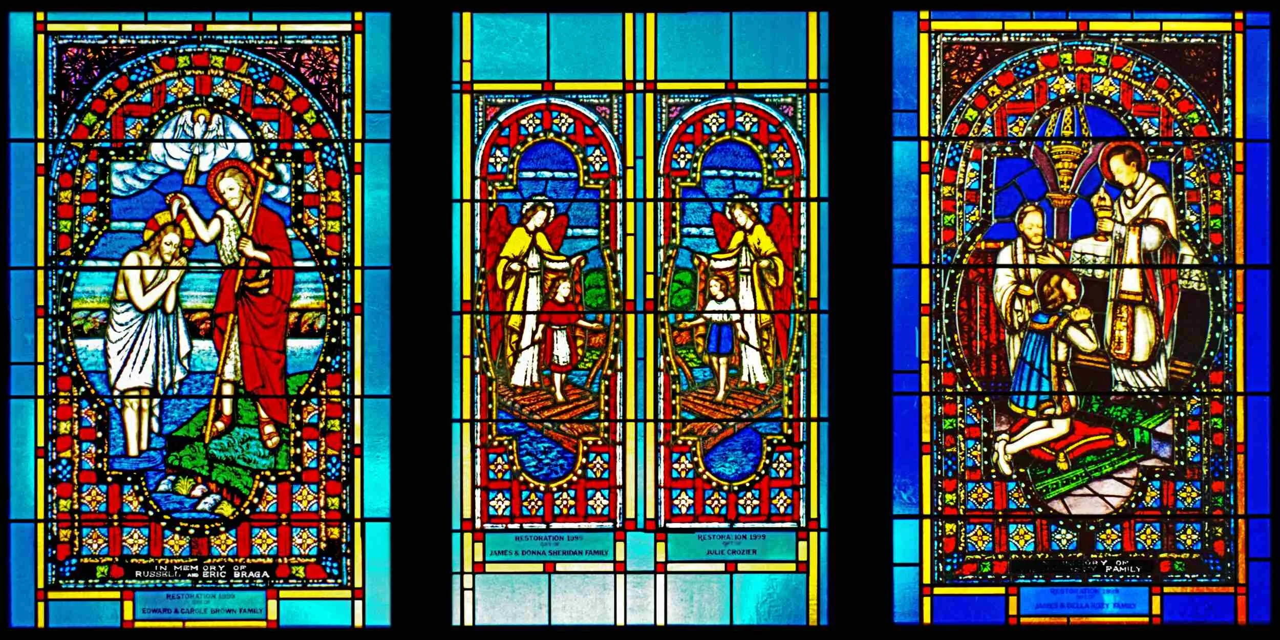 Starting in 1997, Pat Haeger, Haeger Stained Glass, San Jose created five small windows, and the Rosary window in Our Lady of the Rosary Church. She also artfully combined each Huneke window with a sacrament window for seven striking large windows in the nave of Our Lady of the Rosary.